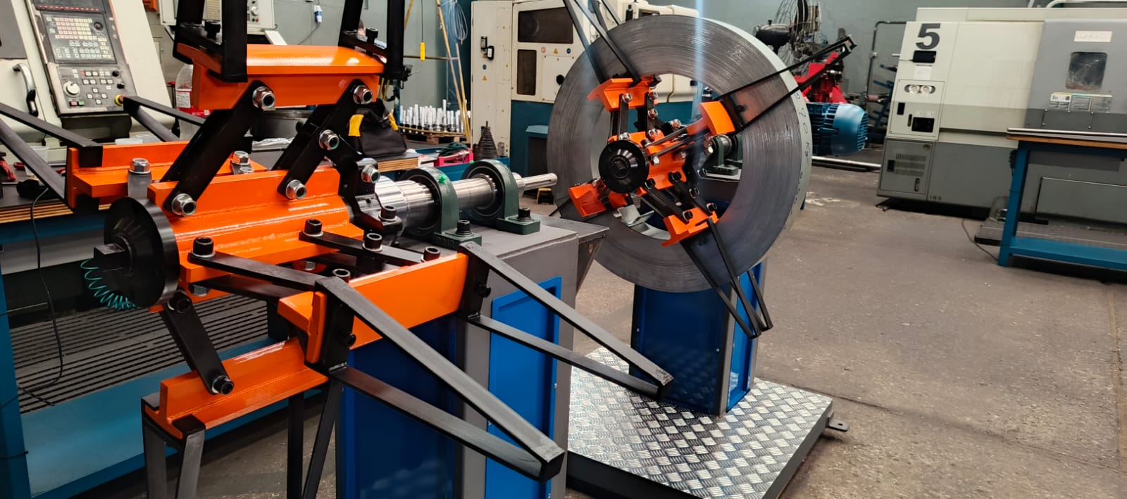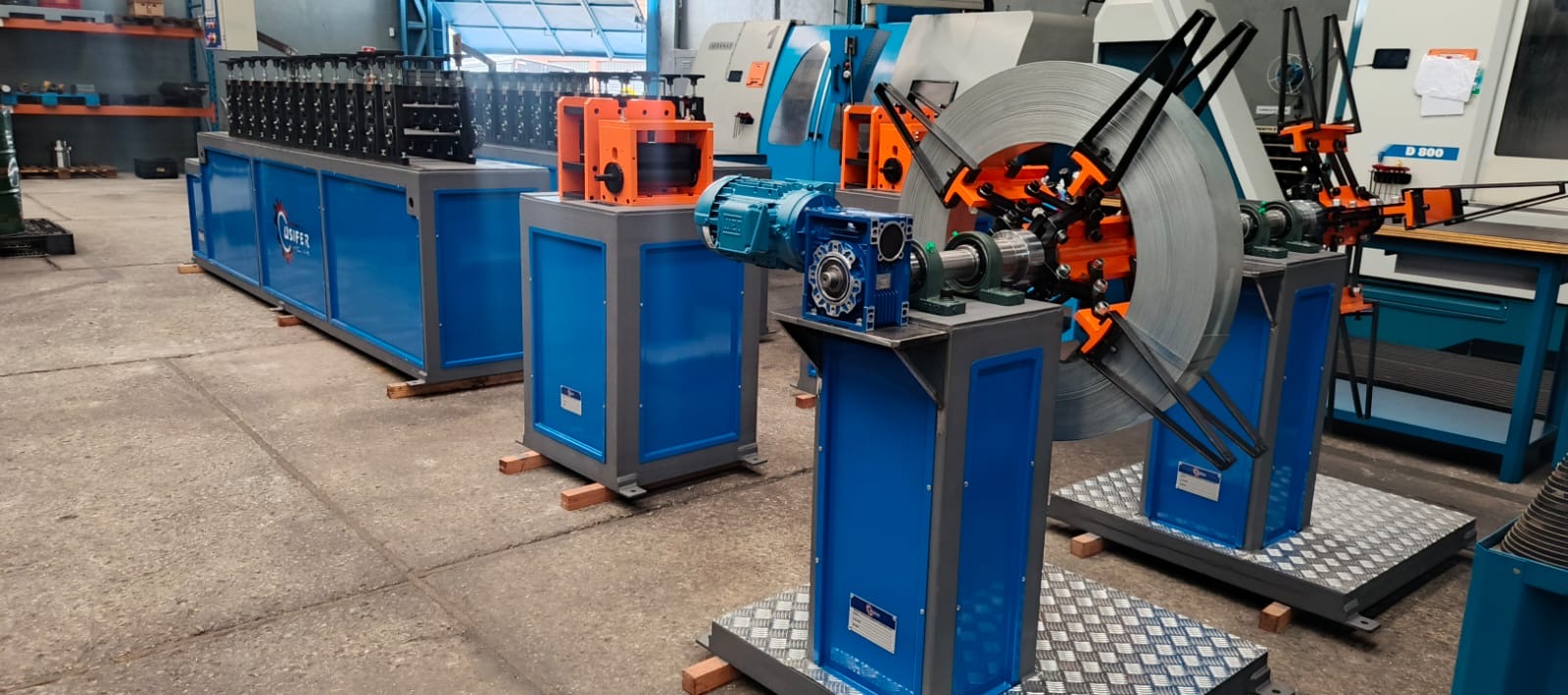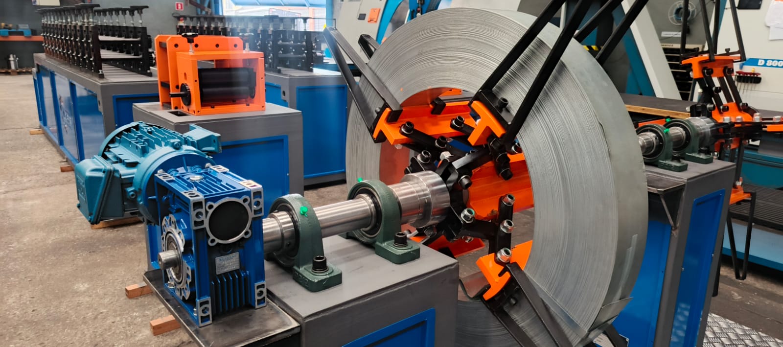 Desbobinador acionado via CLP, operando em perfeita sincronia com o alimentador e a perfiladeira.